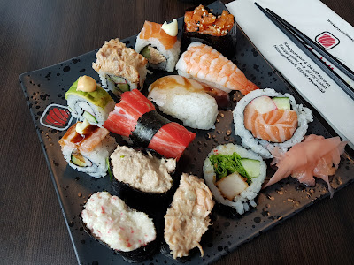 Yhden lomapäivän vietin naapurikaupungissa, Hyvinkäällä. Oikeasti syynä oli hankkia tyttärentyttärelle lääkäritarvikkeet, mutta samaan reissuun yhdistin vähän kirpparikierrosta sekä sushilounaan. Sushiöverit tarkemmin sanottuna.