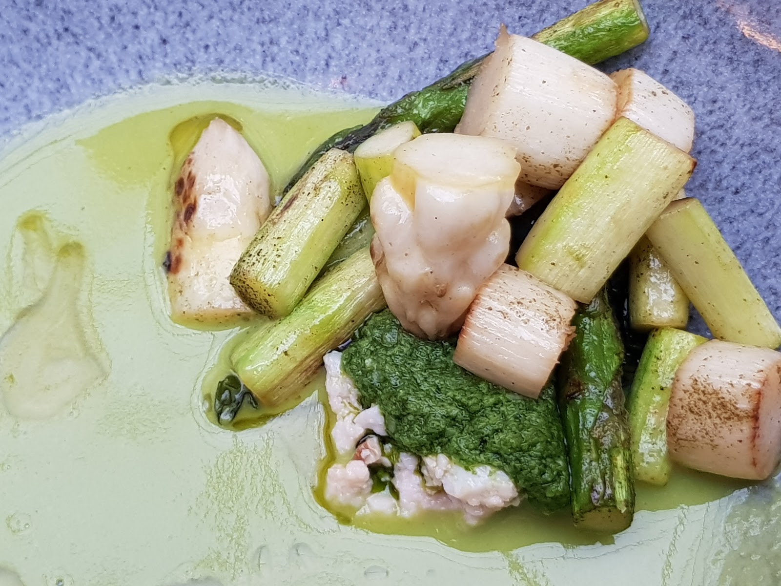 Ja viiniä enemmän pidin sen kanssa tarjostusta parsakeitosta! Vihreää ja valkoista parsaa, chimichurria, yrttejä, savustettua kananmunanvalkuaista. Taivas, mikä keitto! Ja kuten kokki meille kertoi, parsan puisevista osista keitetään keitto (mehän heitämme ne tuhlaavasti roskiin) ja sitten vain parhaat osat kootaan kauniiksi keoksi. Ja mikä huomion arvoista, parsa ei ollut mitään ylikypsää lötköä, vaan suutuntumaltaan rapeaa. Me taidamme kotikeittiöissämme keitellä parsoja vähän turhan pitkään.......
